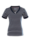 Le T-shirt CADIX pour femme allie confort et style avec subtilité. Ses manches courtes et son col en V orné de croisillons décoratifs apportent une touche féminine et raffinée, tandis que le tissu en interlock rayé 100 % coton assure douceur et tenue tout au long de la journée.